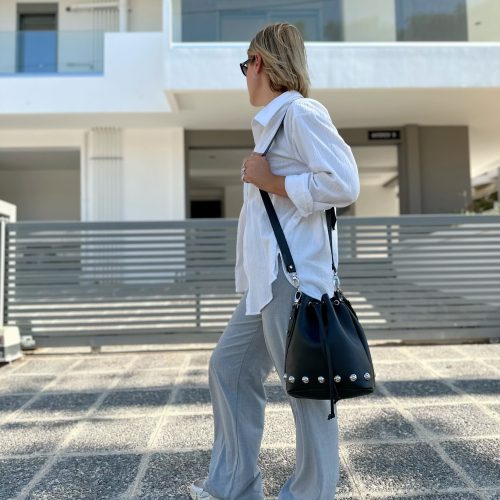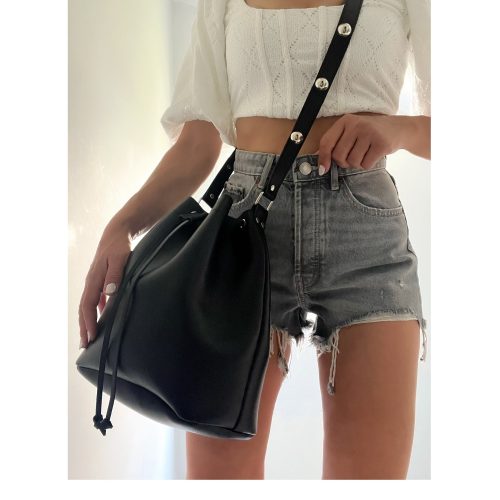 Handmade Black Leather Bucket Bag Crossbody Silver Studded