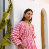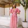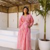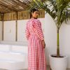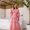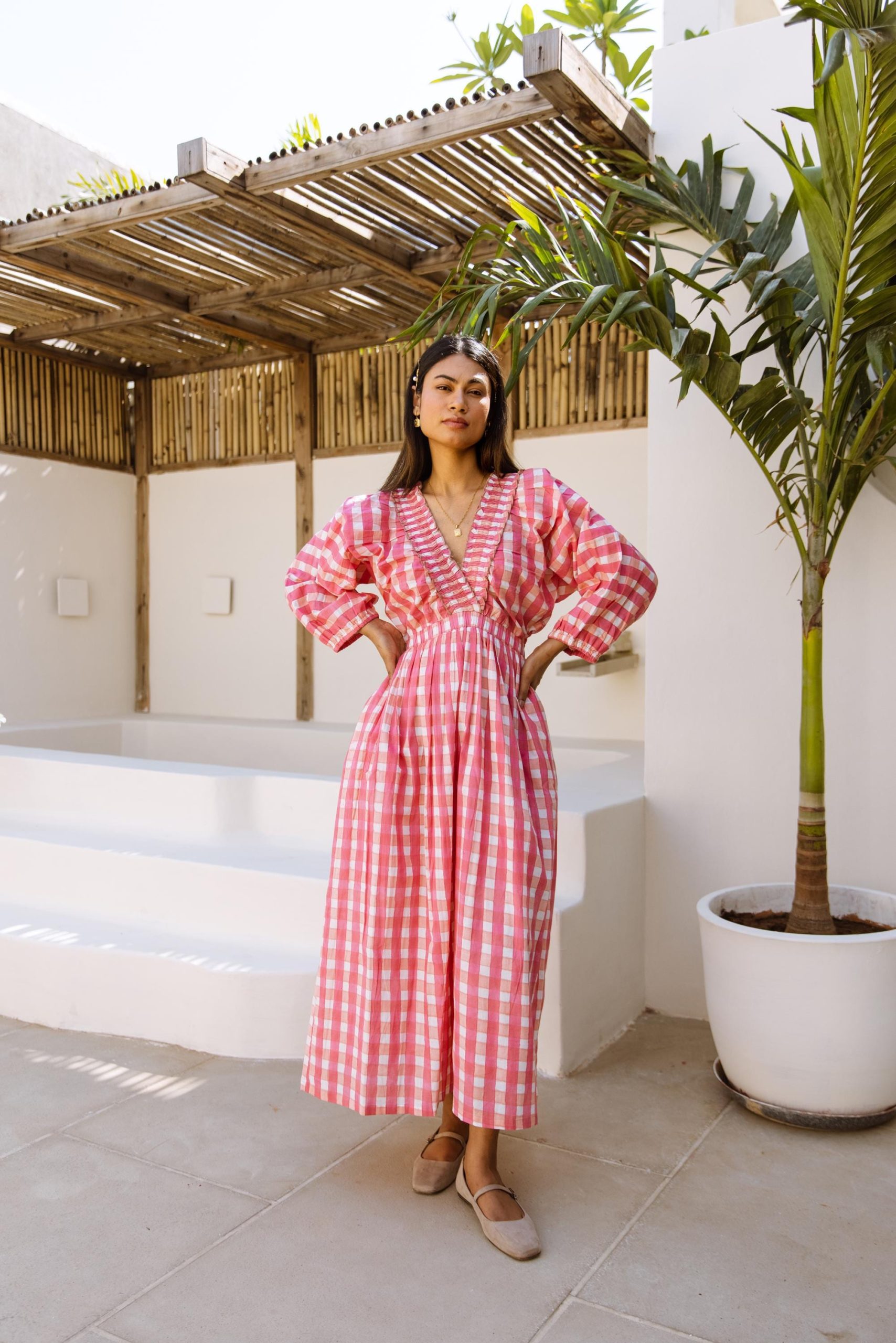 This cotton beauty brings all the joy with its bold block-printed gingham pattern and breezy silhouette. Designed for fun days and good vibes, it’s got pockets, voluminous puff sleeves that make a statement, and a flattering V-neck with a frill detail that adds just the right amount of flirt.