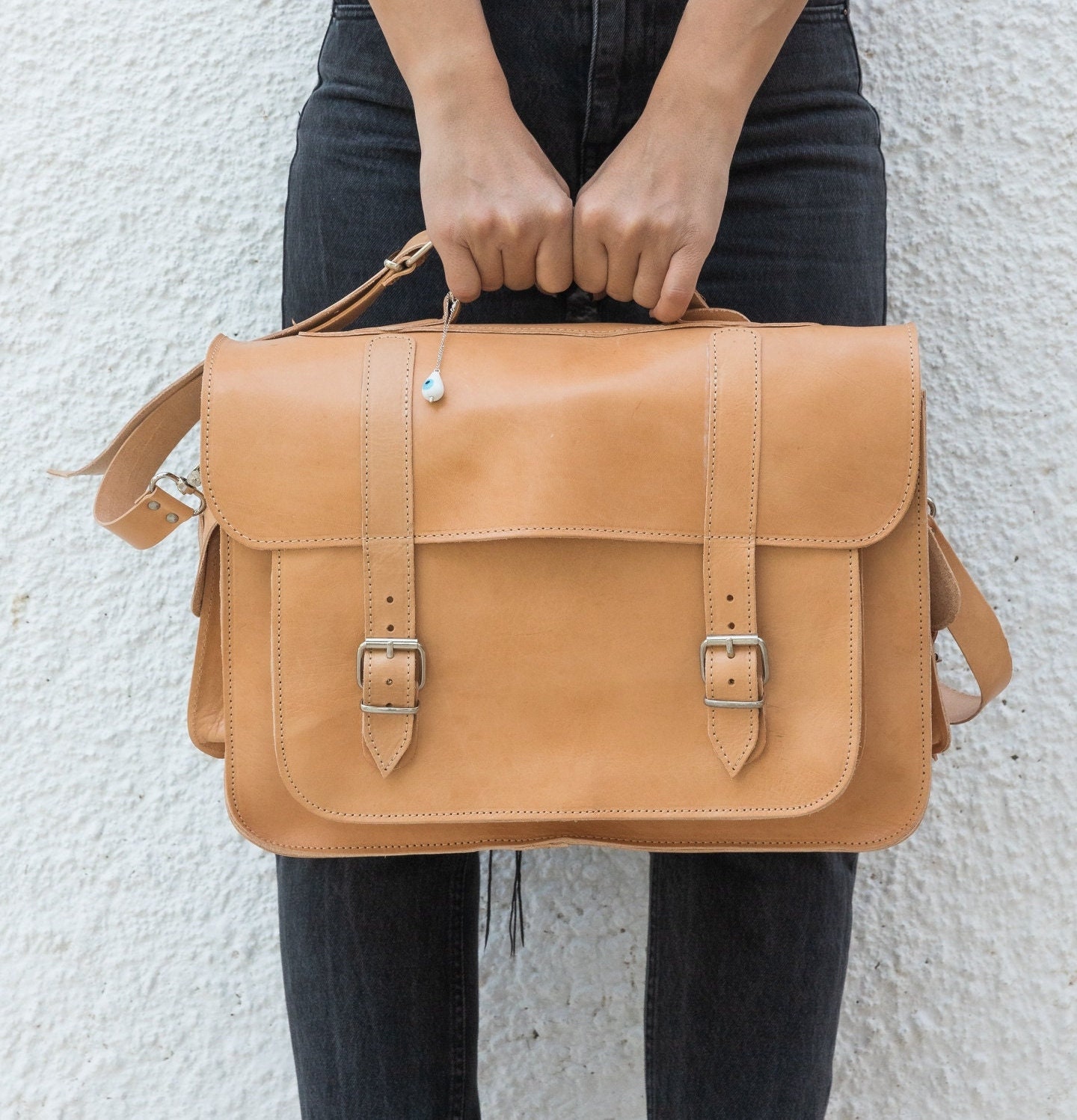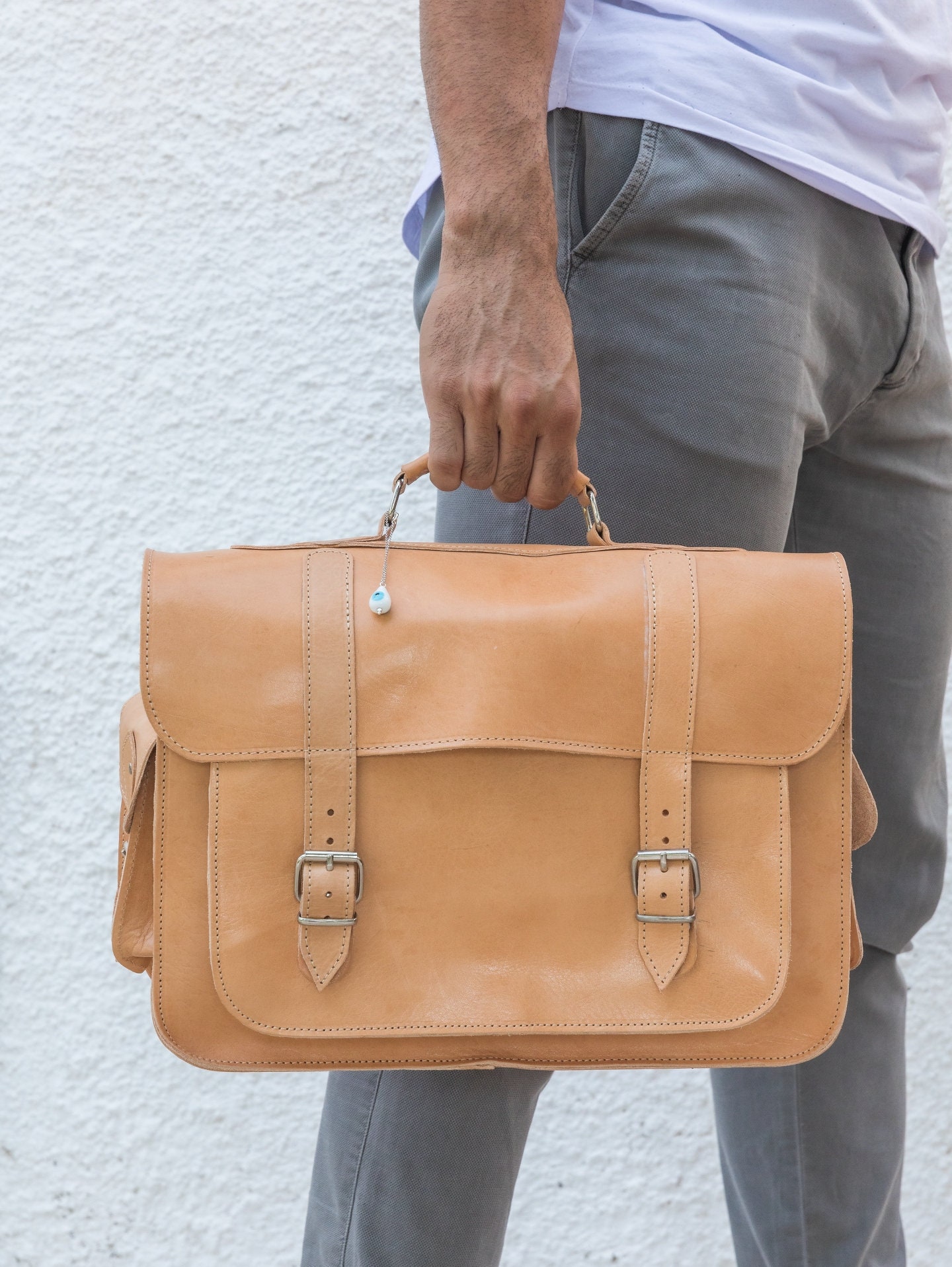 Introducing our handcrafted leather messenger bag, meticulously made from 100% full grain leather in a stunning natural color. This sophisticated briefcase features a removable key ring, adding an element of uniqueness to its design. With ample space, it effortlessly accommodates all your office essentials in style. Perfectly sized to fit a 15″ laptop, this bag exudes both elegance and functionality. Discover this exclusive item only at our Store. Elevate your professional image today.